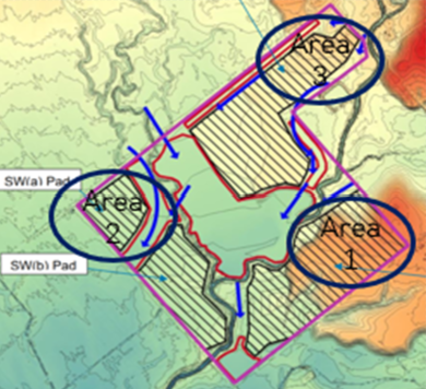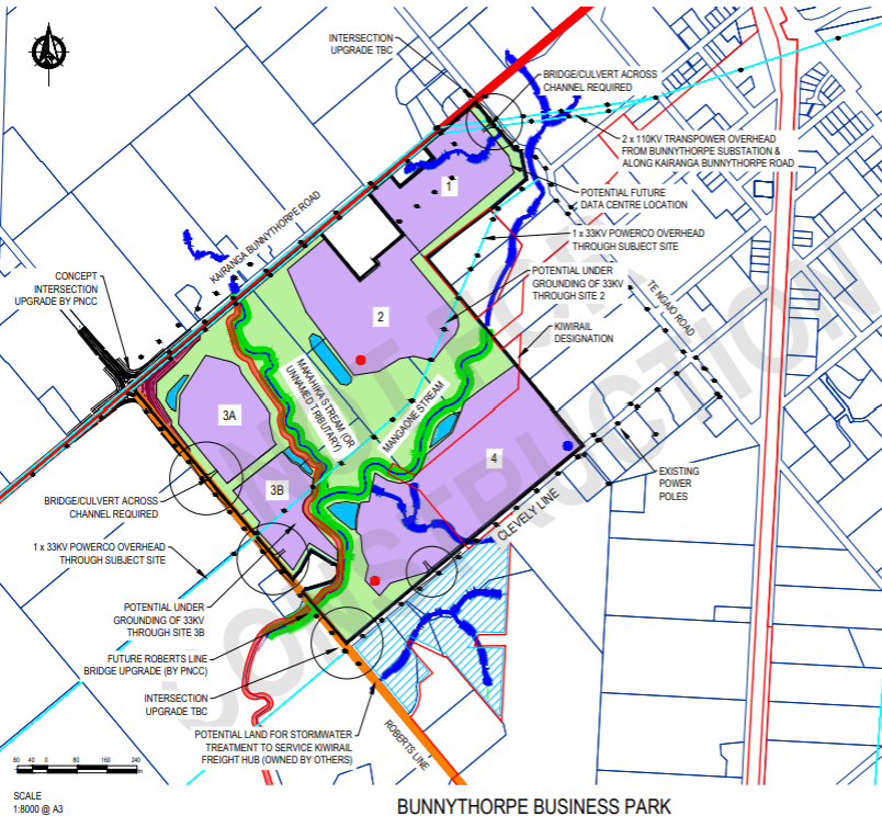 As part of the greater BBP, we are proposing a specialised Business Technology Precinct (BTP) within the Bunnythorpe Business Park (BBP), The tech precinct (BTP) will be positioned for a Tier III/ IV Data Centres. Preferred locations for the BTP (assuming approximately 5-10ha) are in either areas 1, 2 or 3 (adjacent map) dependent on final design constraints and stormwater management. A technology precinct is considered highly favourable in the area given the unique power, fibre, and water supply options. BTP will form part of the BBP private plan change.